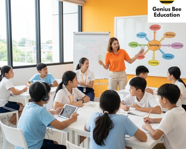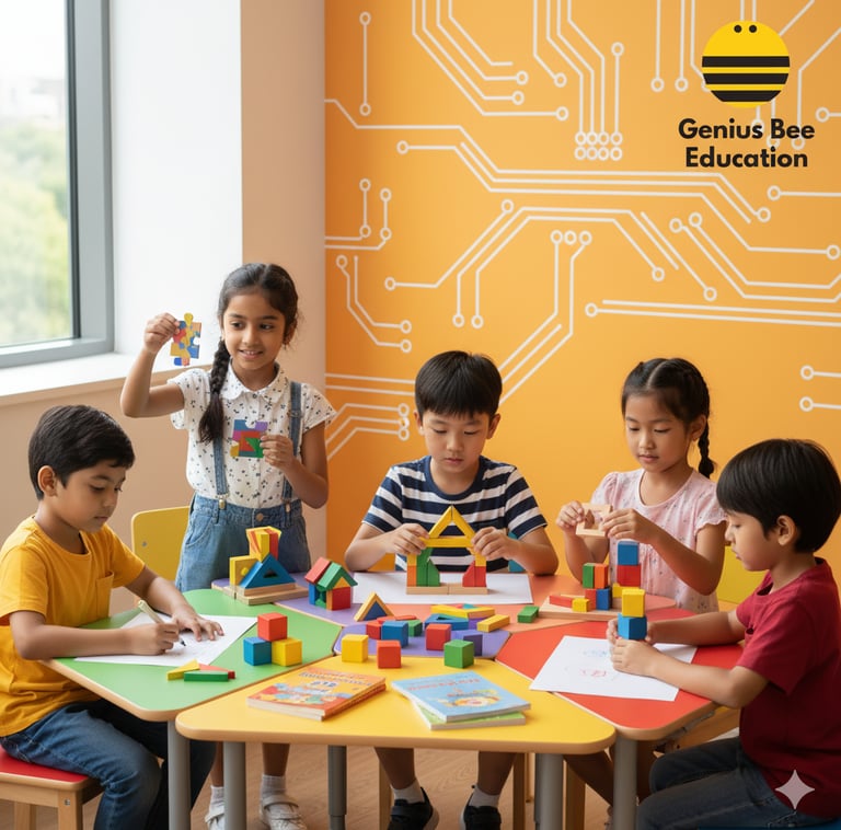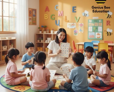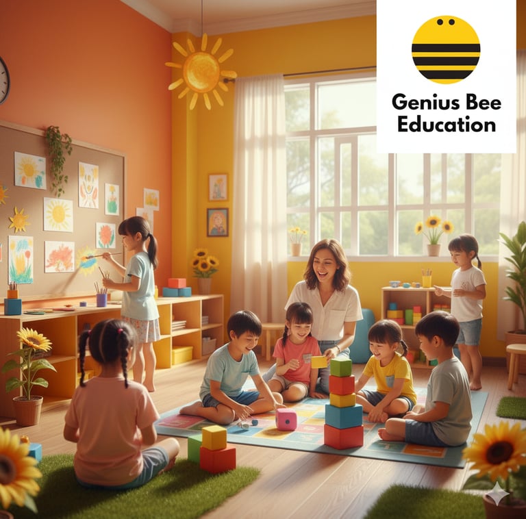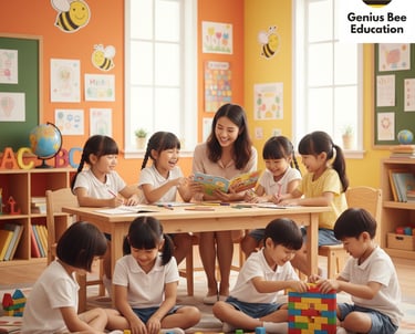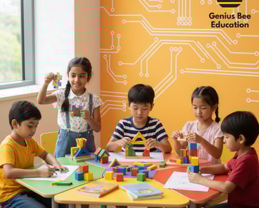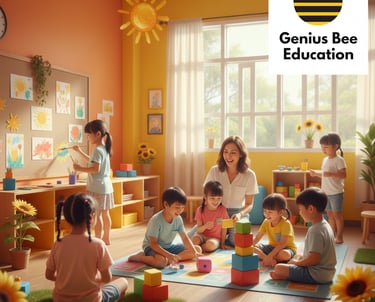 Summer at Genius Bee is full of discovery and fun! Our Summer Classes combine academic refreshers with creative arts, outdoor-style learning, and teamwork activities. Students participate in experiments, language games, storytelling, and art projects that make each day exciting. The program helps children stay active, confident, and curious during school holidays while continuing to learn in a relaxed, joyful atmosphere. With bright orange-yellow classrooms and caring teachers, our summer lessons make every moment both educational and unforgettable.