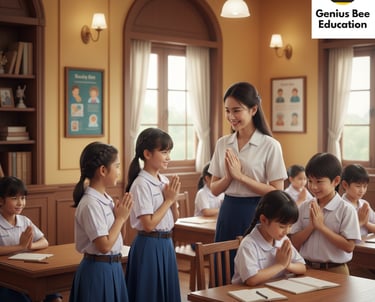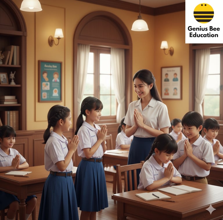 Our Etiquette Class helps children learn the art of politeness, respect, and graceful communication — essential skills for life. Through fun activities and real-world practice, students develop social confidence, table manners, respectful speaking habits, and empathy toward others. The Thai teacher models kind and positive behavior, guiding students to act thoughtfully in any setting — home, school, or community. This class encourages emotional intelligence, kindness, and cultural awareness, helping children grow into well-mannered and confident individuals who respect themselves and others.